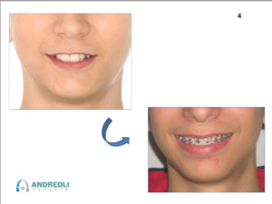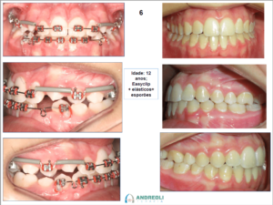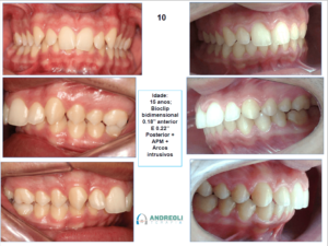 Idade: 15 anos; Bioclip bidimensional .018″ anterior e .022″ posterior + APM + Arcos intrusivos