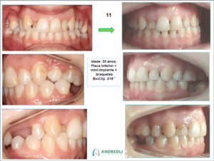 Idade: 30 anos; Placa inferior + mini-implante + bráquetes BioClip .018″